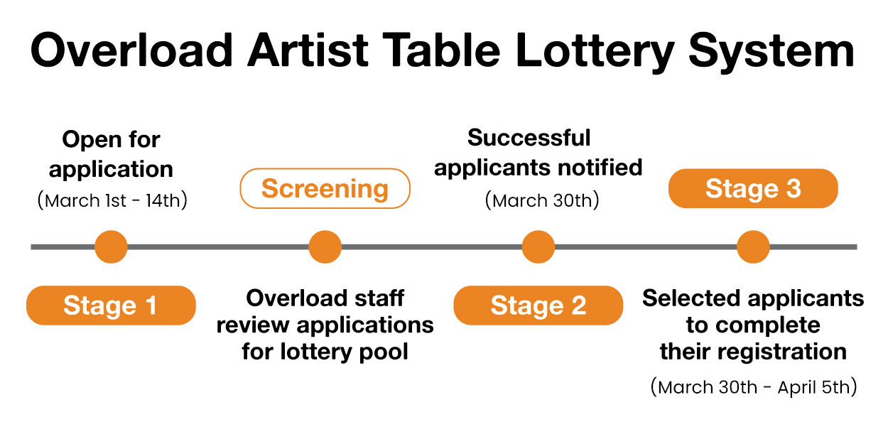 Overload 2026 uses a lottery system inspired by Japan’s Comiket, where applications will open for an extended period of time. Applications that meet the initial screening criteria, will then be randomly selected and offered the chance to complete the registration and secure an Overload Artist Table. Artists who are not accepted in the initial results due to capacity limits will be waitlisted and may be contacted when a table space becomes available.